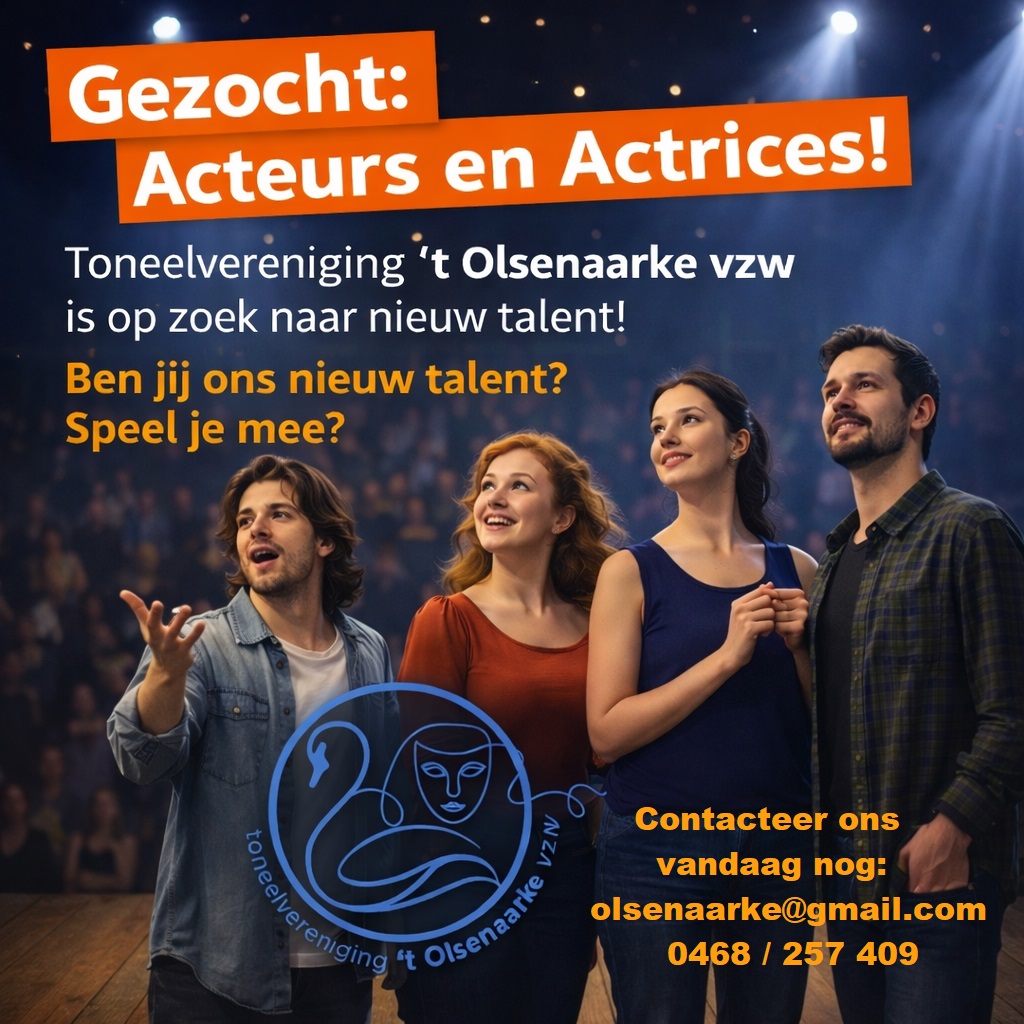 Toneelvereniging ’t Olsenaarke vzw zoekt, ter uitbreiding van hun cast, nieuw acteertalent (M/V/X)!